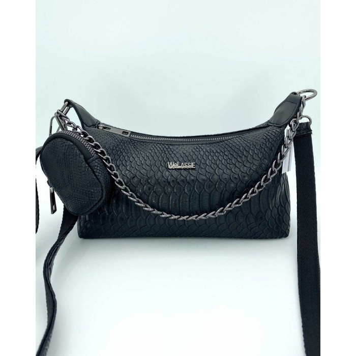 Сумка жіноча 64806 виробник Welassie (Україна) виконана з екошкіри високої якості. Сумка відкривається за допомогою блискавки. Усередині сумка на щільній підкладці, є відкрита кишеня для дрібних предметів. Плечовий ремінь укріплений стопою, регулюється під різну довжину, максимальна довжина 140 см. Сумка прикрашена ланцюжком, який можна використовувати як ручку. Довжина ланцюжка 41 см. В комплекті є маленька сумочка-гаманець на блискавки з розмірами: довжина 7 см., Ширина 3 см., Висота 10 см.