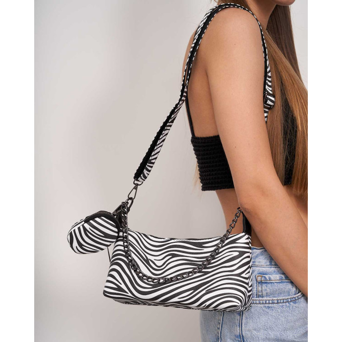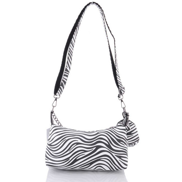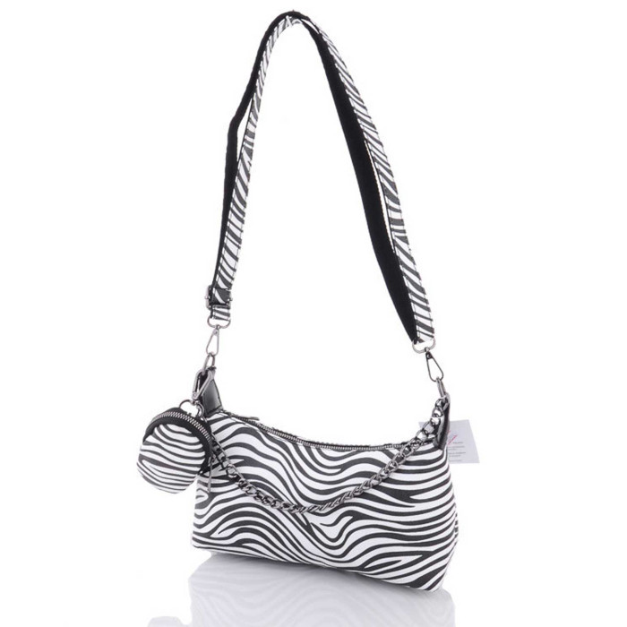 Жіноча сумка 64824 від виробника «Welassie» Україна, колір чорнобілий, матеріал сумки екошкіра високої якості. Сумка відкривається за допомогою застібки-блискавки. Усередині сумка на щільній підкладці є відкрита кишеня для дрібних предметів. Плечовий ремінь укріплений стопою, регулюється під різну довжину, максимальна довжина 140 см. Сумка прикрашена ланцюжком, який можна використовувати як ручку. Довжина ланцюжка 41 см. У комплекті є маленька сумочка-гаманець на застібці з розмірами: довжина 7 см, ширина 3 см, висота 10 см.