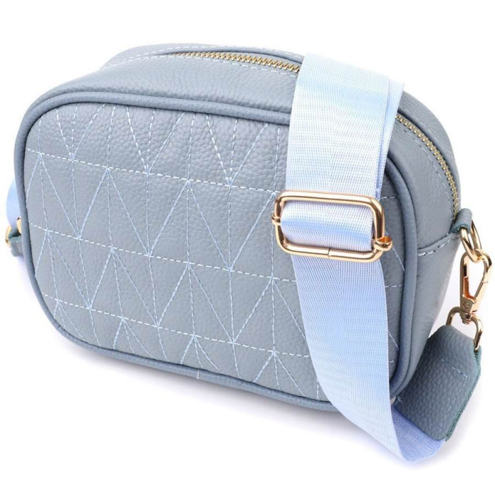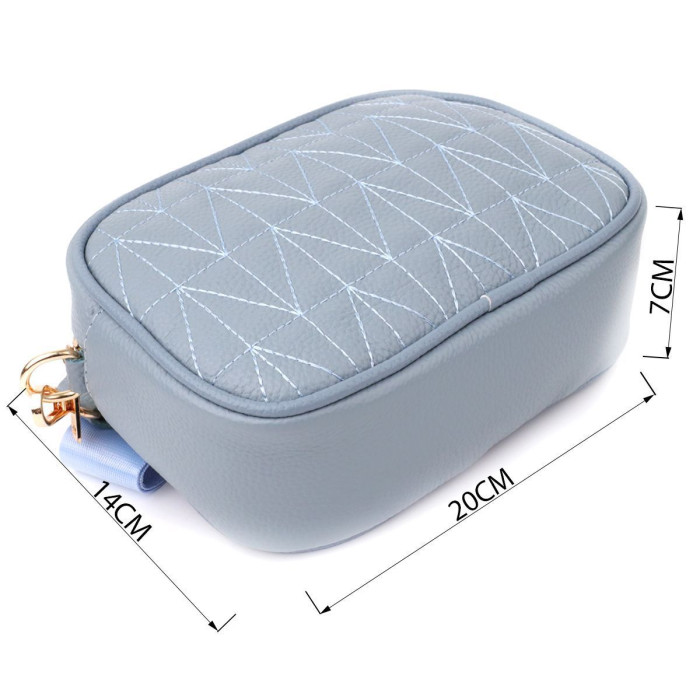 Витончена стьобана сумка Vintage у сіро-блакитному кольорі з натуральної шкіри стане стильним та незвичайним аксесуаром, додаючи свіжості та легкості образу. Щільна та якісна шкіра робить сумку приємною на дотик та підкреслює високий рівень виконання. Компактна форма надає акуратного та сучасного вигляду, а стібка на лицьовій стороні додає дизайнерський шарм. Сумка закривається на блискавку, всередині розташоване основне відділення з кишенею на блискавці та відкритою кишенею для дрібниць, а на тильній стороні знаходиться зовнішня кишеня на блискавці для зручного зберігання найнеобхідніших речей. Знімний текстильний ремінь, що регулюється, забезпечує комфорт при носінні, а фурнітура під жовте золото гармонійно відтіняє холодний сіро-блакитний тон шкіри. Ця сумка стане універсальним аксесуаром для повсякденних образів та особливих випадків, підкреслюючи витончений смак та любов до якісних матеріалів.