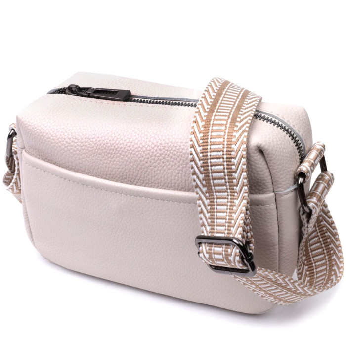 Сучасна жіноча сумка на всі випадки із натуральної якісної шкіри. Аксесуар складається з основного відділення, яке закривається на блискавку, а також двох кишень зовні на лицьовій та тильній стороні. Носити сумку можна в руці, під рукою, на плечі і через плече, для цього є текстильний ремінь, що не знімається. В аксесуарі використано якісну фурнітуру кольору темного срібла. У нашому магазині Ви зможете придбати якісний шкіряний аксесуар, який завжди порадує жінку будь-якого віку.