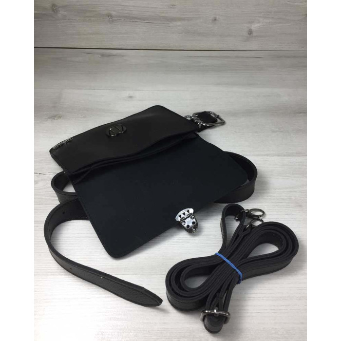 Купити клатч чорний або сумку на пояс Арья, виготовлена з штучної шкіри. Кришка відкривається за допомогою засувки. Всередині має три відділення. В комплекті є плечовий ремінець і поясный ремінь
