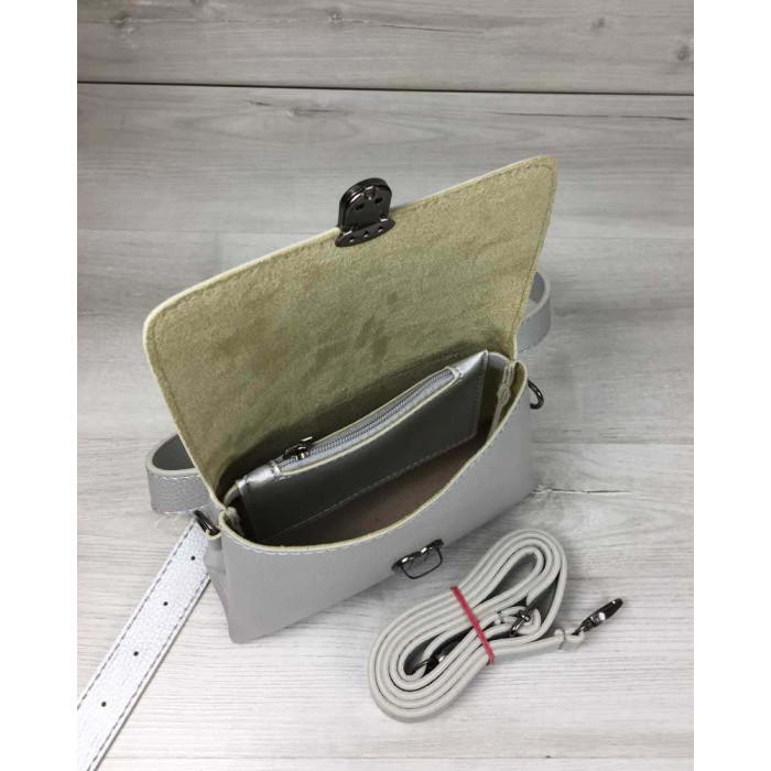 Клатч сріблястий або сумка на пояс Белла, виготовлена з штучної шкіри. Кришка відкривається за допомогою засувки. Всередині має вшиту косметичку на блискавці. Додатково в комплекті є плечовий ремінець.