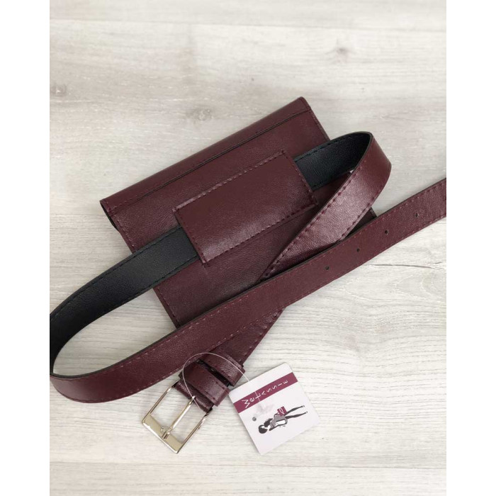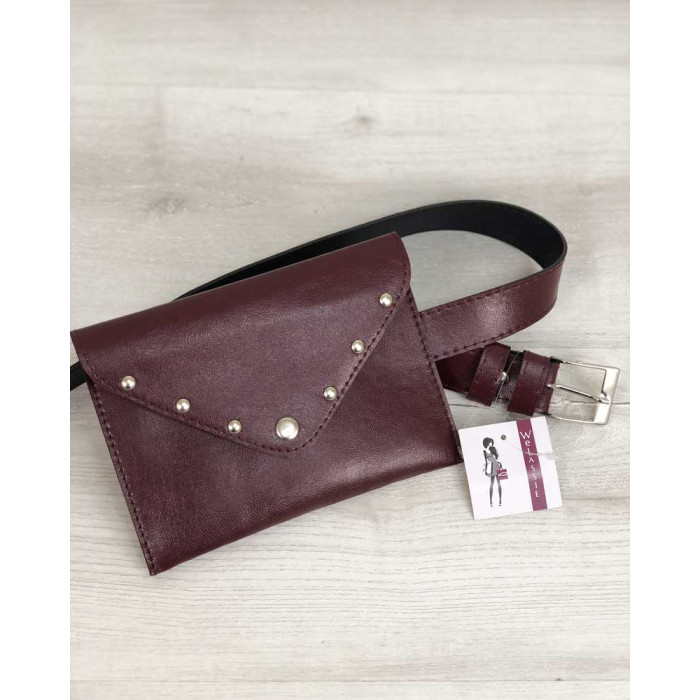Жіночий клатч на пояс, виготовлений з штучної шкіри. Кришка відкривається за допомогою кнопки. Усередині одне відділення. Кришка по периметру оздоблена крабиками. Довжина поясного ременя 105 см.