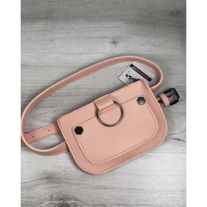 Жіноча сумочка на пояс Кеті, виготовлений з штучної шкіри. Відкривається за допомогою блискавки. Усередині одне відділення без підкладки. Спереду є відкритий кишеня для дрібних предметів. Додатково сумочка прикрашена кільцем діаметром 4,5 см Довжина поясного ременя 105 см.