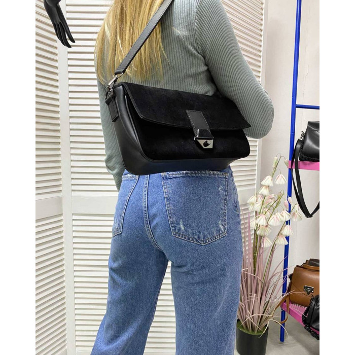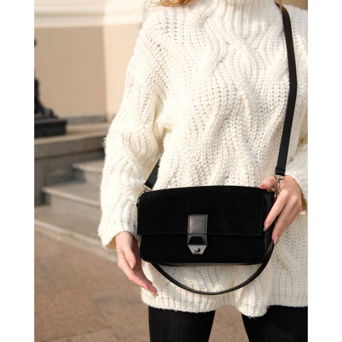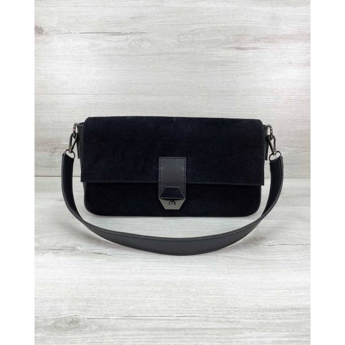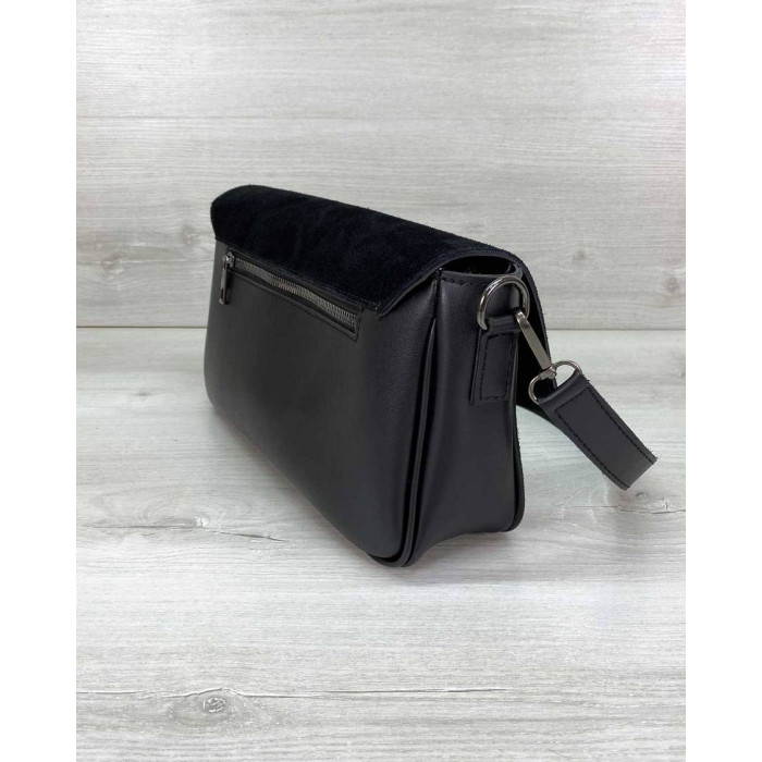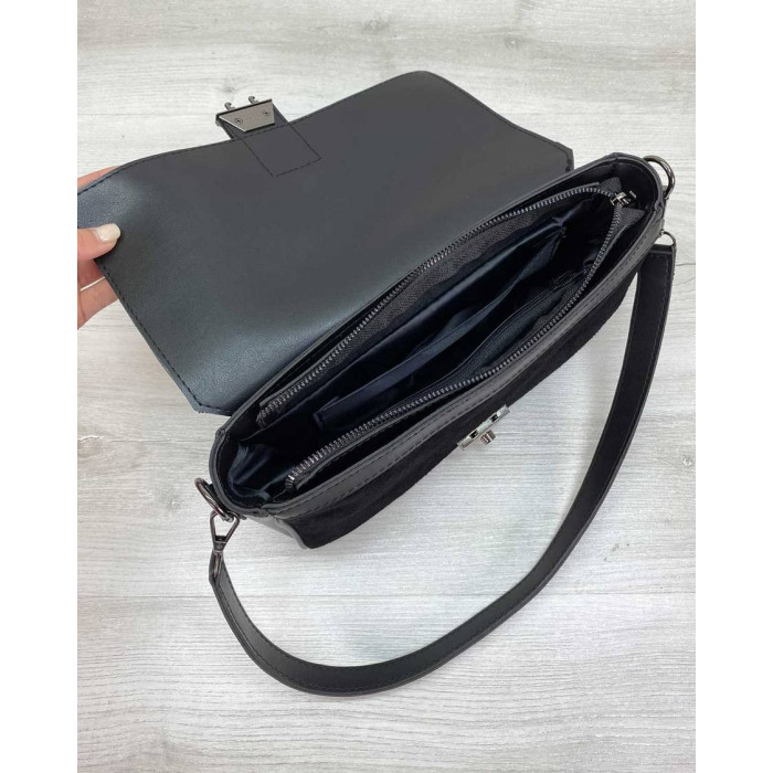 Жіноча стильна сумка 62805, виробник Welassie (Україна) виконана з екошкіри високої якості, спереду сумки вставки натуральний замш. Сумка відкривається за допомогою замка. Має одне відділення на блискавці. Усередині сумка на підкладці, має дві кишені: на блискавці і відкрита. Зовні кишеня для дрібних предметів. Довжина плечового ременя 120 см. Розміри сумки: довжина 28 см., ширина 8 см, висота 16 см.