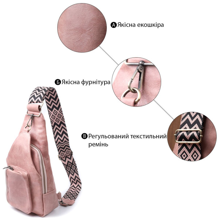 Компактна слінг сумка для жінок з красивою фактурною екошкірою. Дана модель складається з одного основного відділення, яке закривається на блискавку і в якому знаходиться дві кишені відкритого типу всередині, а також двох кишень зовні та одного отвору для кабелю або навушників, що дуже зручно в сучасному світі. Акцентом даної моделі є зручний регульований плечовий ремінець у етнічному стилі, що дуже модно вже кілька сезонів. Екошкіра - високоякісна альтернатива натуральному матеріалу, яка дуже стійка до тертя, до низьких температур, відмінно носиться на відміну від інших штучних матеріалів, а також має гіпоалергенний склад на відміну від натуральної шкіри. Відмінний варіант сумки, який порадує будь-яку дівчину, тому що всі речі під рукою та в безпеці.
