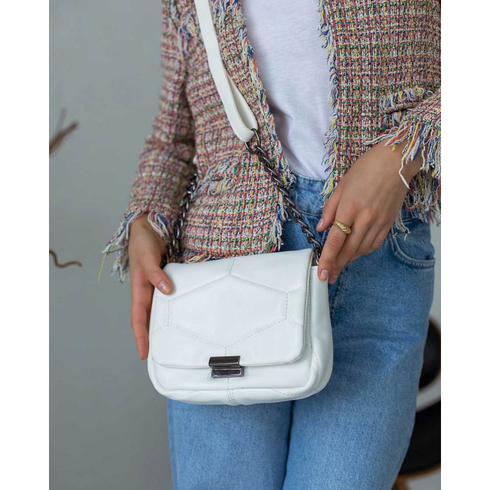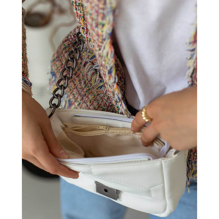 Маленька жіноча сумка стьобана 90500 від виробника «Welassie» Україна з екошкіри високої якості. Сумка відкривається за допомогою замка і блискавки. Усередині сумка на щільній підкладці. Вшита посередині косметичка ділить сумку на дві частини. Також всередині має відкриту кишеню. Ручка сумки прикрашена ланцюжком. Замок сумки відкривається натисканням на кнопку збоку під кришкою. Плечовий ремінь прикрашений ланцюжком, регулюється під різну довжину, максимальна довжина 135 см.