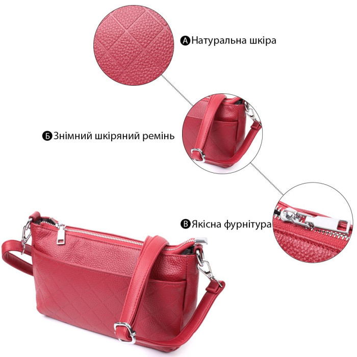 Жіноча прямокутна сумка з натуральної шкіри високої якості. Виріб дуже зручний, можна носити на плечі та в руках. На лицьовій стороні сумка декорована ромбоподібним тисненням, що надає особливого шарму виробу. Модель доповнена фурнітурою кольору срібла. Аксесуар має три відділення, і дві кишеньки - одна на блискавці та одна відкритого типу, у відділенні, що посередині. Ідеальний варіант сумки на кожен день.