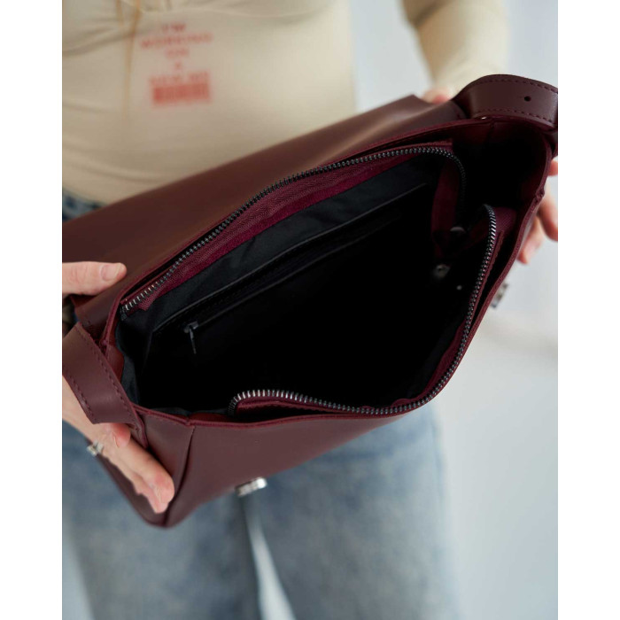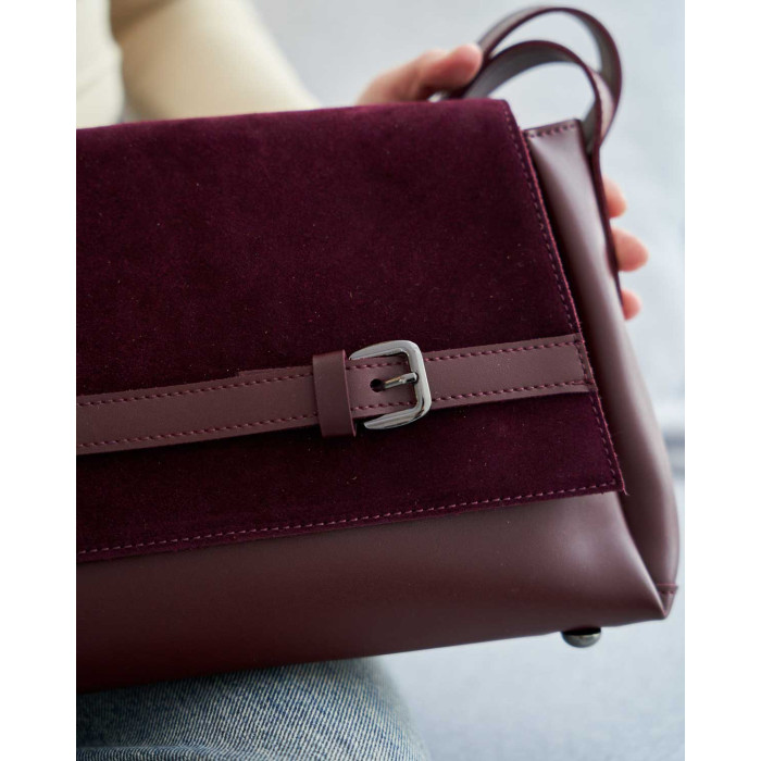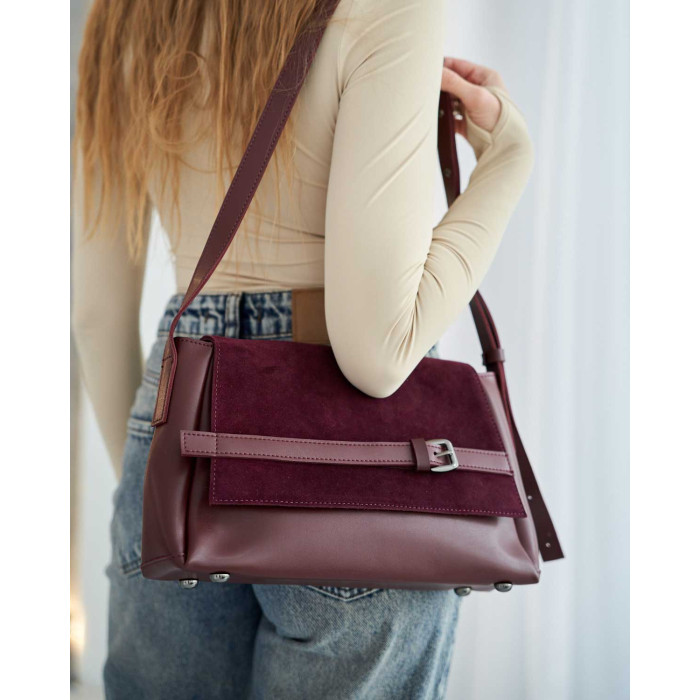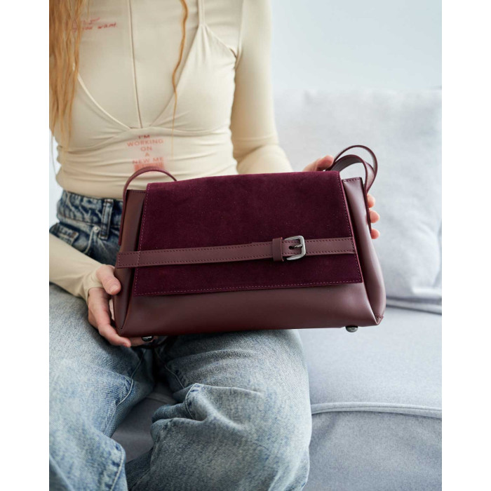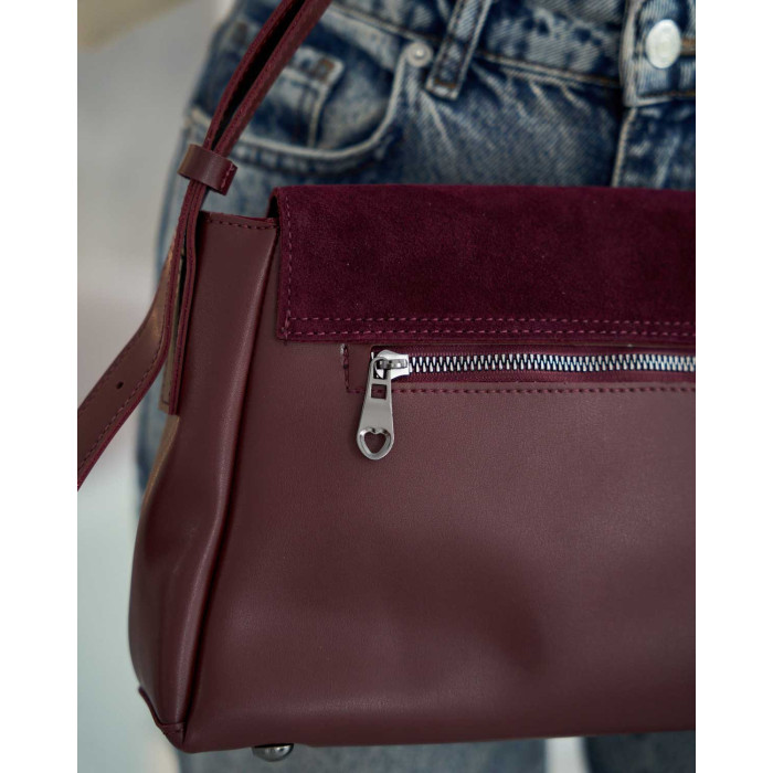 Сумка жіноча 14257 від виробника «Welassie» Україна, колір бордовий, матеріал натуральна замша та екошкіри високої якості. Сумка відкривається за допомогою магніту та застібки під клапоном. Усередині має відкриту кишеню та кишеню на застібці.