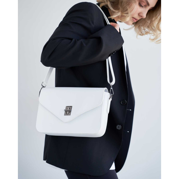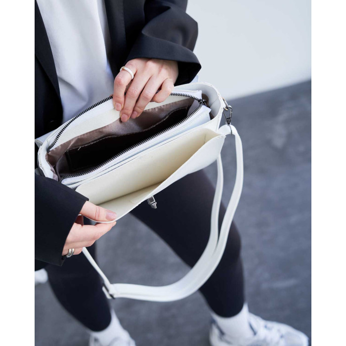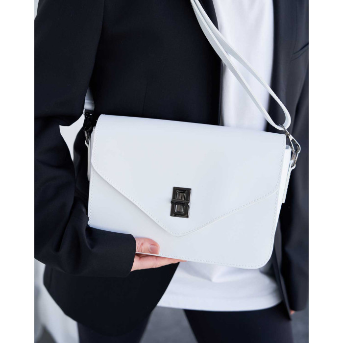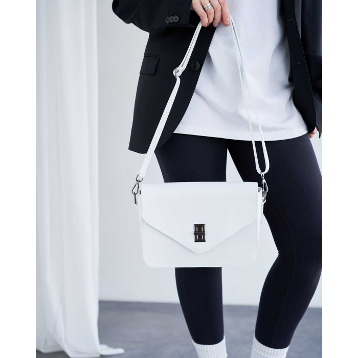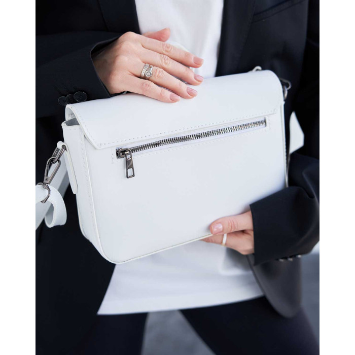 Сумка жіноча 11100 від виробника «Welassie» Україна, колір білий, матеріал сумки екошкіра високої якості. Сумка відкривається за допомогою замка та застібки-блискавки. Сумка на щільній якісній підкладці. Усередині має відкриту кишеню для дрібних предметів. Також має відкриту кишеню під кришкою і ще один карман на застібці зовні.