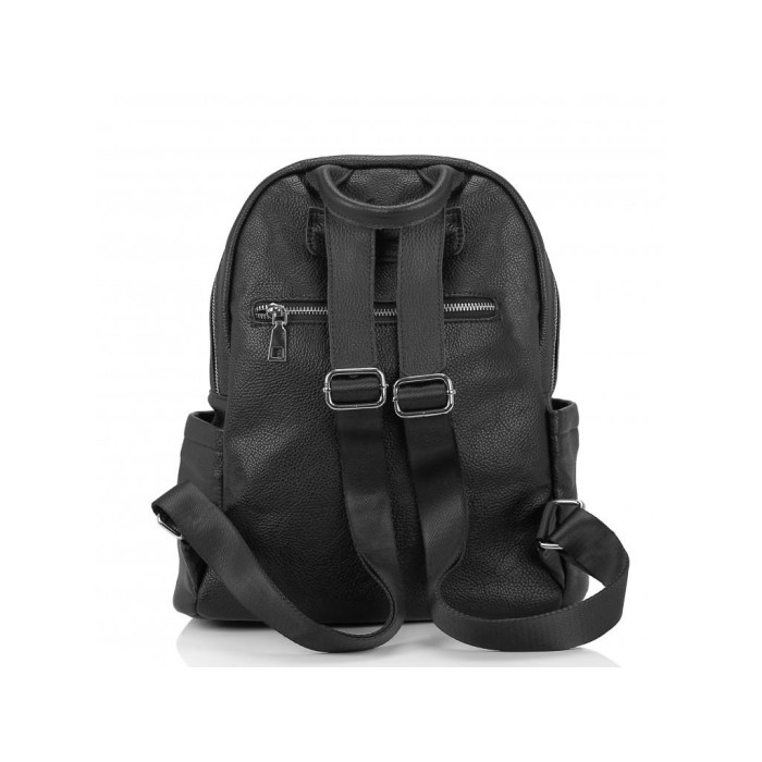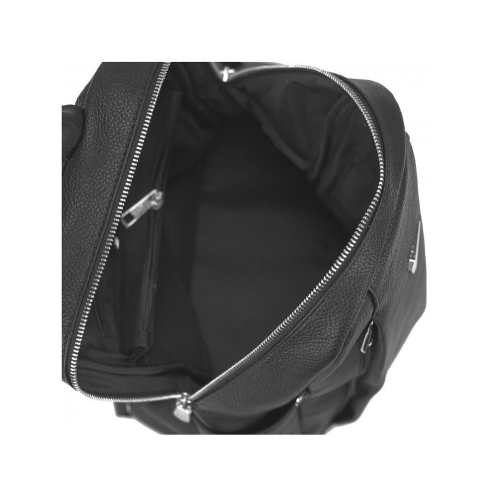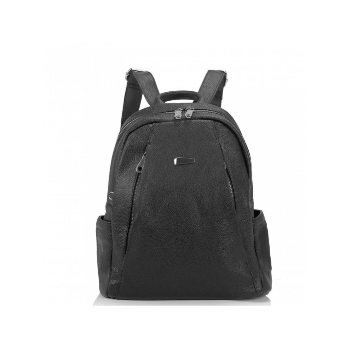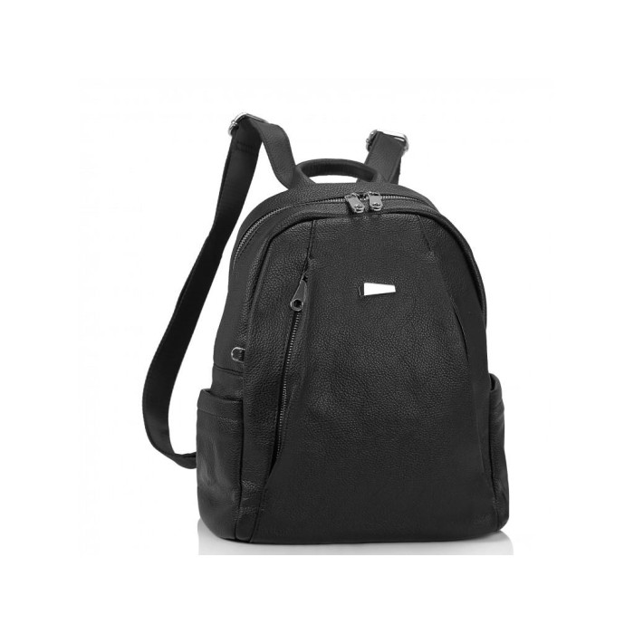 Жіночий шкіряний рюкзак чорного кольору. Місткий і при цьому виглядає акуратно і стильно. Фурнітура в рюкзака надійна срібляста. Жіночий рюкзак оснащений одним великим відділенням, в якому є дві кишені на блискавці і три кишені відкритого типу для дрібниць. З лицьової частини є дві кишені вертикального типу, з тильної частини- одна кишеня на блискавці. З боків рюкзака є дві додаткових кишені відкритого типу.