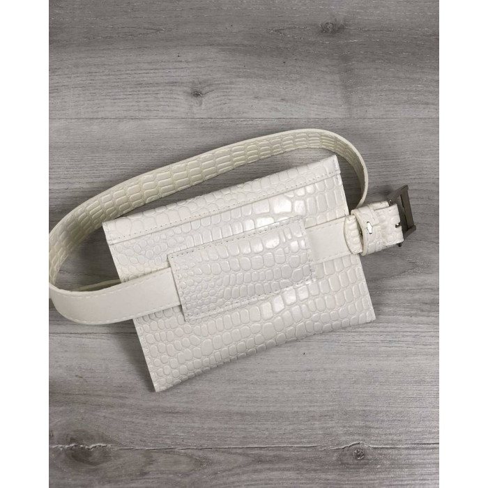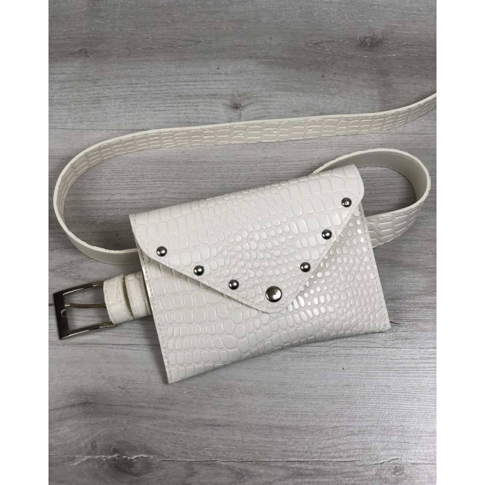 Жіночий клатч на пояс, виготовлений з штучної шкіри. Кришка відкривається за допомогою кнопки. Усередині одне відділення. Кришка по периметру оздоблена крабиками. Довжина поясного ременя 105 см.