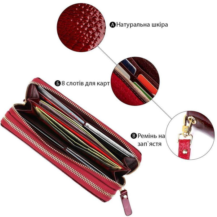 Чудовий місткий клатч для ділових і прагматичних жінок. Матеріал виготовлення першокласна натуральна шкіра, вкрита лаком. Має гладку фактуру з імітацією під шкіру крокодила. Бордовий колір виробу виглядає дуже жіночно і модно. Клатч має два окремих відділення, які закриваються на металеву масивну блискавку в золотому кольорі. Всередині розташовано досить відділень і кишень для всіх Ваших цінностей. Такий аксесуар стане просто невід'ємною частиною вашого гардеробу або чудовим подарунком коханій жінці. Упакований клатч в фірмову картонну коробку.