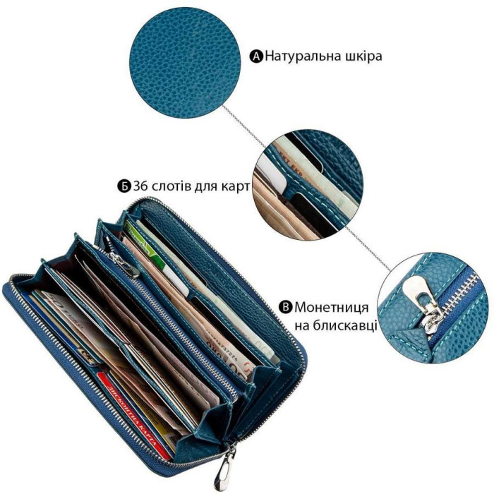 Чудовий багатофункціональний клатч для сучасних ділових жінок. Виконаний з натуральної високоякісної шкіри, ніжною і м'якою на дотик. Має стильний і модний дизайн, а особливий шарм надає гаманцю освіжаючий колір морської хвилі. Головною відмінною характеристикою є величезна кількість кишень для різних карток і візиток, таких є аж тридцять шість штук. Тому клатч гордо можна називати також і візитниця. Вас неодмінно порадують багато різних відділень для купюр і інших цінностей. Для швидкого доступу до дрібниці, монетниця розташована на зовнішній стороні клатчу і закривається на блискавку. Упаковано виріб в білу щільну картонну коробку з фірмовим логотипом.
