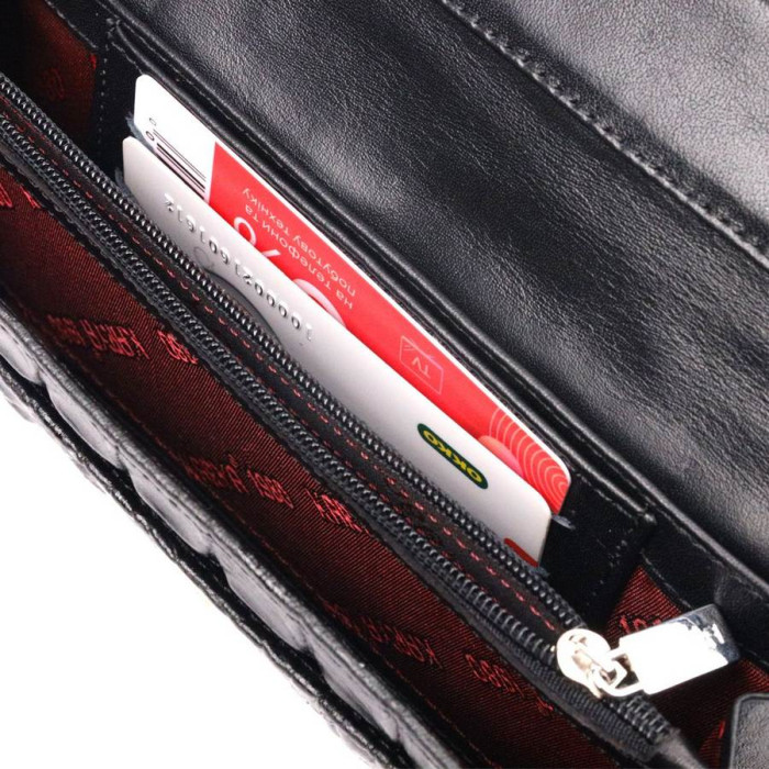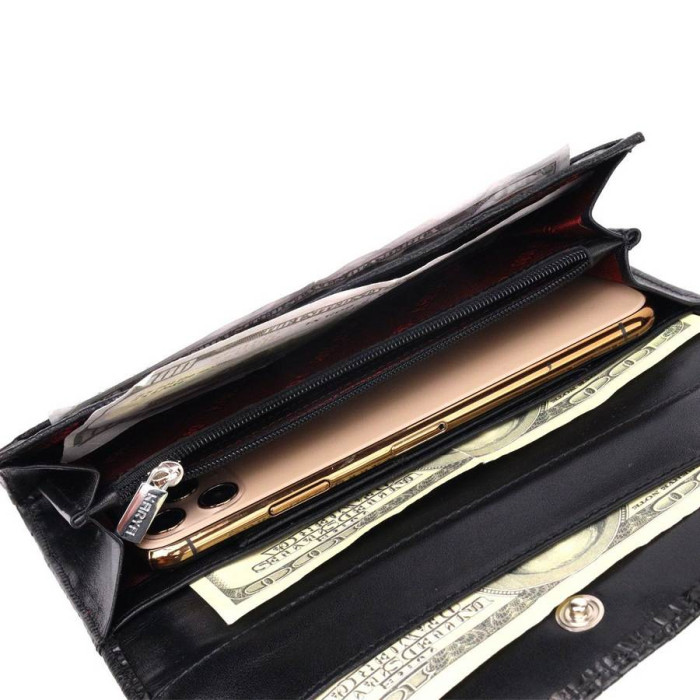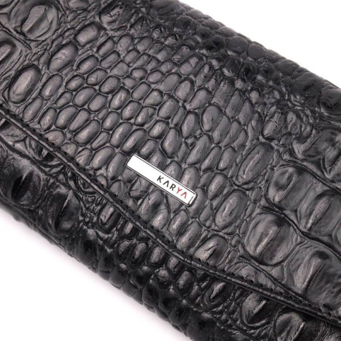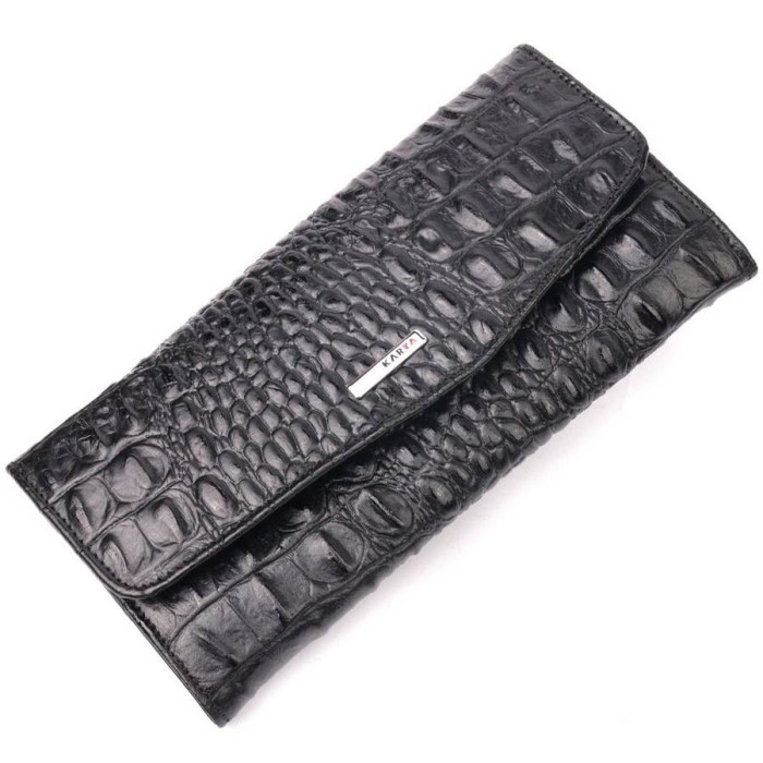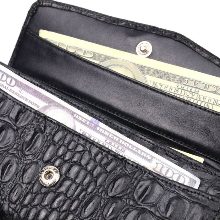 Чудовий жіночий гаманець з натуральної шкіри, з тисненням під крокодила, в чорному кольорі. Складається аксесуар навпіл, закривається клапаном на кнопку. Якісна фурнітура доповнює та прикрашає виріб. Такий гаманець з натуральної шкіри - це ідеальний варіант на кожен день для тих, хто цінує якість, зручність та комфорт, а також чудово доповнюватиме Ваш повсякденний образ. Запакований аксесуар у фірмову коробку та пакет бренду. Вироби з натуральної шкіри завжди будуть чудовим подарунком для близької людини.