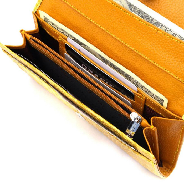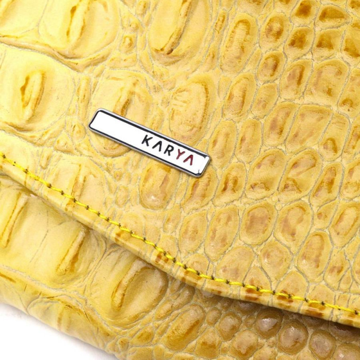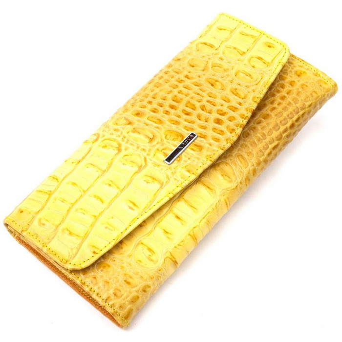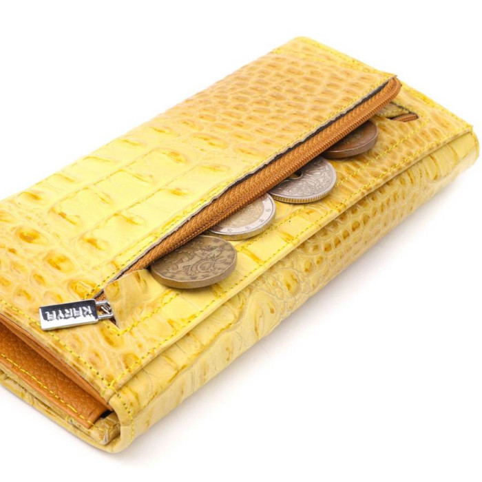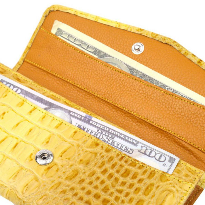 Чудовий жіночий гаманець з натуральної шкіри, з тисненням під крокодила, в жовтому кольорі. Складається аксесуар навпіл, закривається клапаном на кнопку. Якісна фурнітура доповнює та прикрашає виріб. Такий гаманець з натуральної шкіри - це ідеальний варіант на кожен день для тих, хто цінує якість, зручність та комфорт, а також чудово доповнюватиме Ваш повсякденний образ. Запакований аксесуар у фірмову коробку та пакет бренду. Вироби з натуральної шкіри завжди будуть чудовим подарунком для близької людини.
