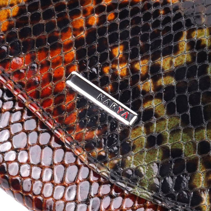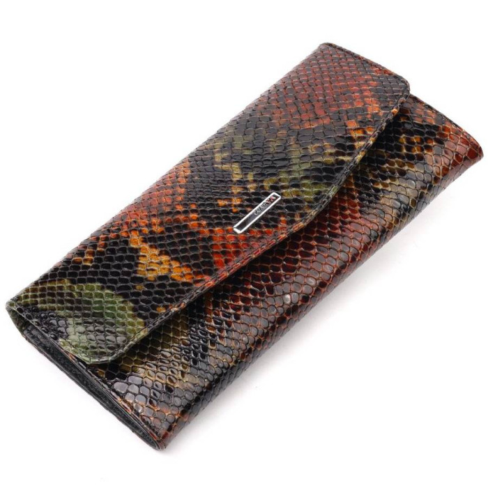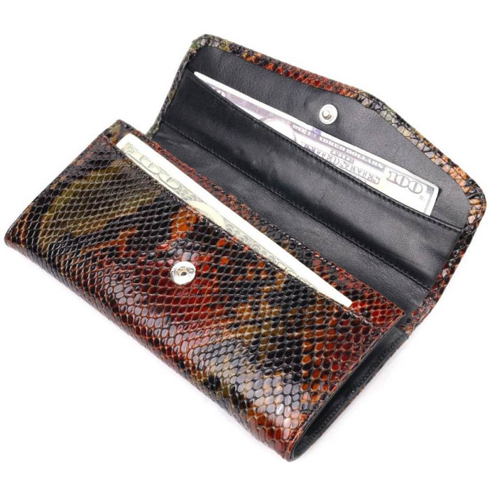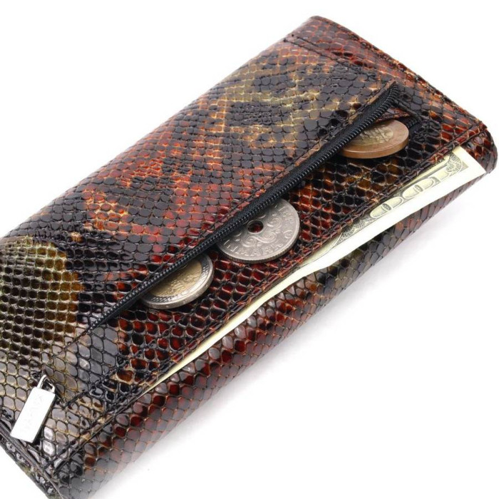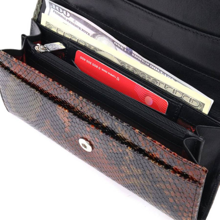 Стильний жіночий гаманець із натуральної шкіри, з тисненням під рептилію. Складається аксесуар навпіл, закривається клапаном на кнопку. Якісна фурнітура доповнює та прикрашає виріб. Такий гаманець з натуральної шкіри - це ідеальний варіант на кожен день для тих, хто цінує якість, зручність та комфорт, а також чудово доповнюватиме Ваш повсякденний образ. Запакований аксесуар у фірмову коробку та пакет бренду. Вироби з натуральної шкіри завжди будуть чудовим подарунком для близької людини.