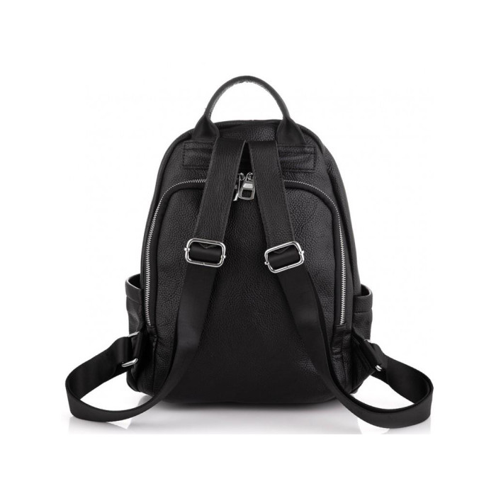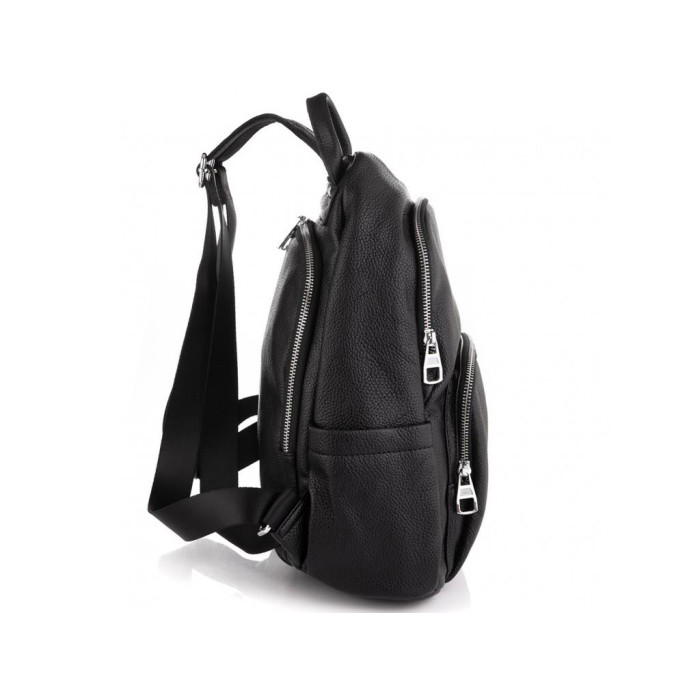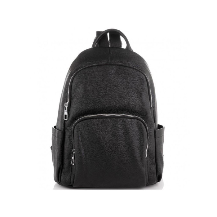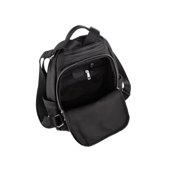 Жіночий рюкзак чорного кольору в зернистій шкірі. Головне відділення велике, замок до нього розташований на тильній частині рюкзака. З лицьового боку кишеня на блискавці і накладна кишеня меншого розміру також на блискавці. Усередині рюкзака маленька кишеня для дрібниць. Також з боків є маленькі кишені відкритого типу.