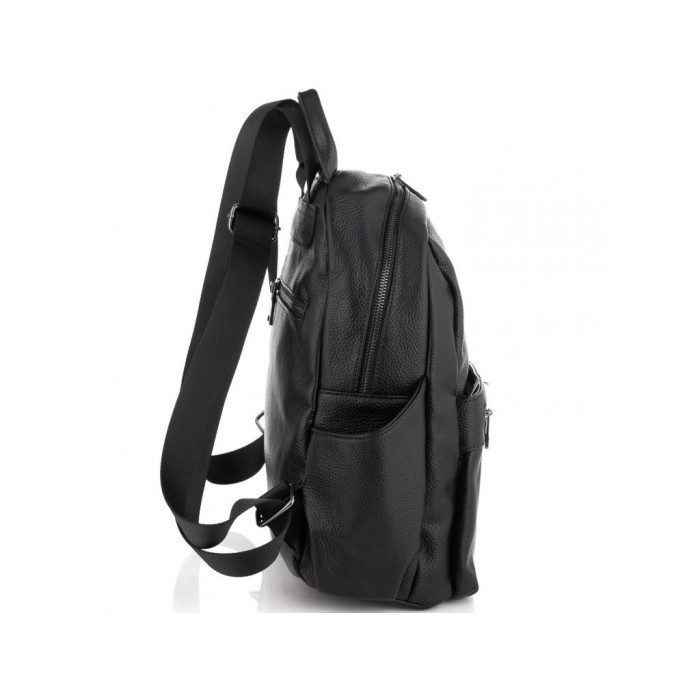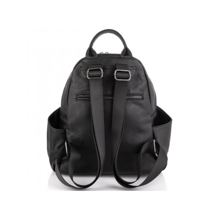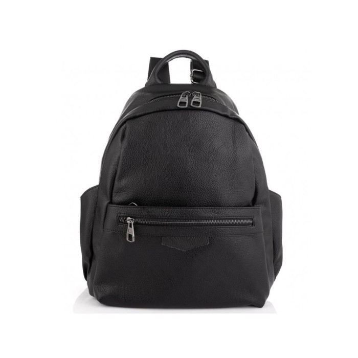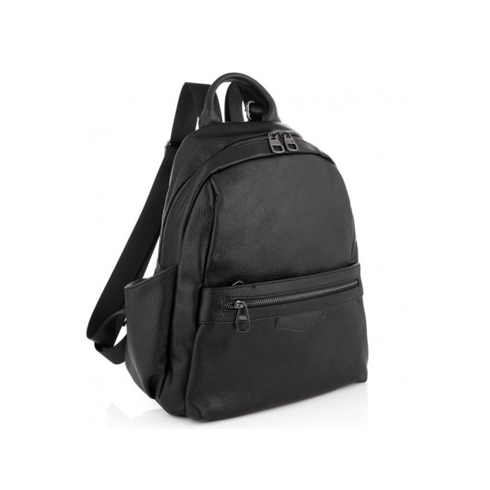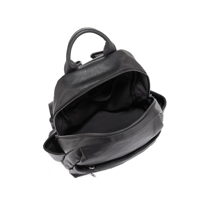 Жіночий рюкзак чорного кольору, місткий. Є шкіряна ручка і плечові шлейки текстильні. Один великий відділ містить у собі кишеню на блискавці і багато кишень відкритого типу для дрібниць. З лицьового боку є дві додаткові кишені на блискавці, з тильного боку також є кишеня на блискавці, з боків рюкзака розташовані дві кишені відкритого типу.