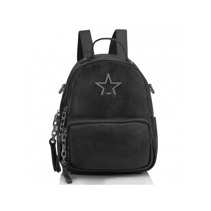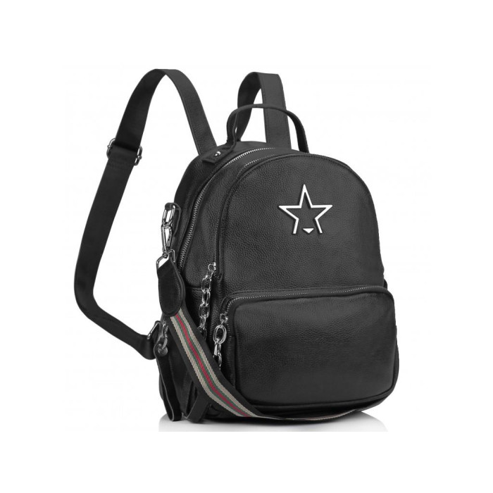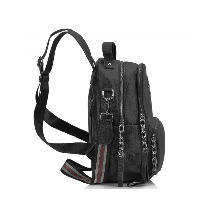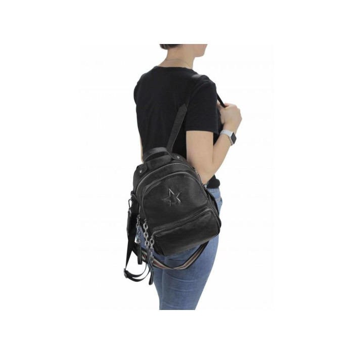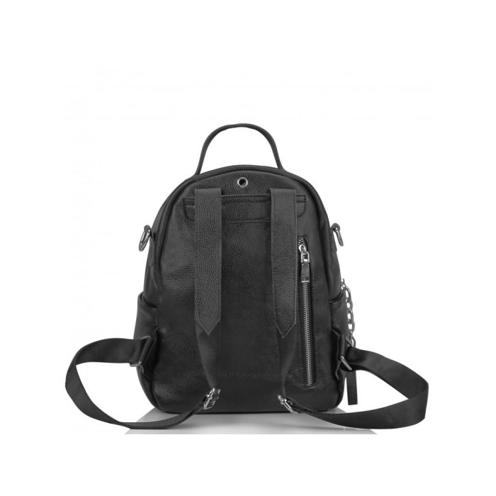 Компактний жіночий рюкзак чорного кольору на кожен день. Для зручного носіння є плечові ремені, які регулюються по довжині і шкіряна ручка для носіння в руці. Передбачено один основний відділ на блискавці, всередині якого є кишеня-перегородка на блискавці, дві кишені відкритого типу і маленька кишеня на блискавкці. З тильного боку вертикальна кишеня на блискавці.