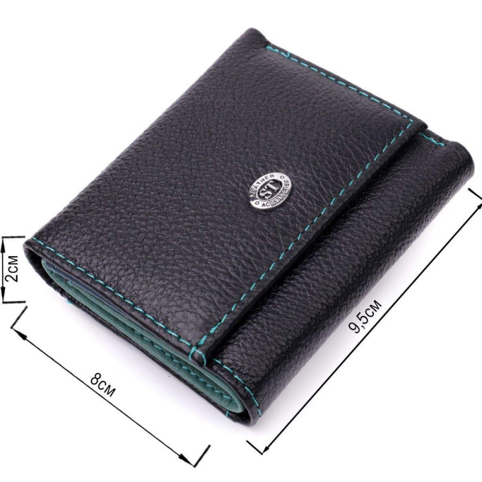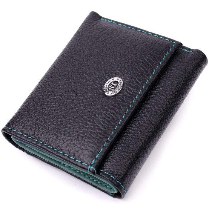 Практичне жіноче портмоне в три складення з натуральної шкіри найвищої якості. Акцентом цього гаманця є колір, точніше кілька кольорів – він чорного кольору зовні та багатобарвний усередині. Аксесуар складається з двох містких відділень для купюр, двох осередків для карток та кишені для монет. Зовні виріб прошитий рівним рядком бірюзового кольору по краю і прикрашений металевим логотипом компанії виробника. Портмоне доповнено надійною фурнітурою та міцною підкладкою. Укомплектований гаманець у фірмову картонну коробку білого кольору.