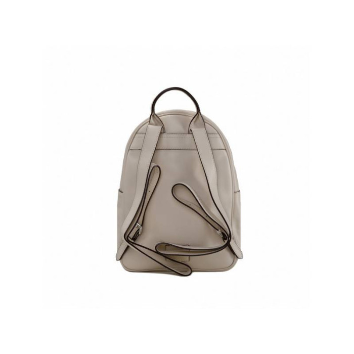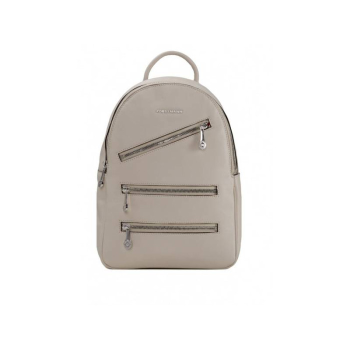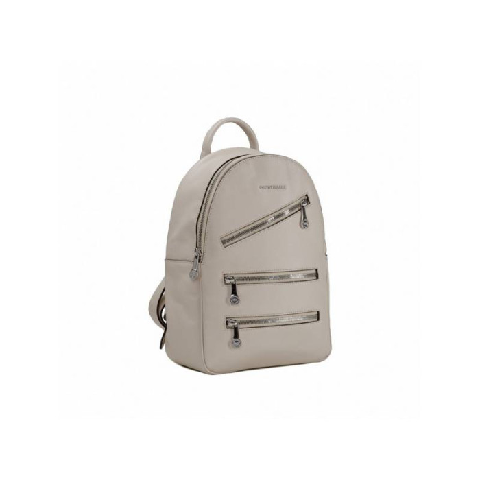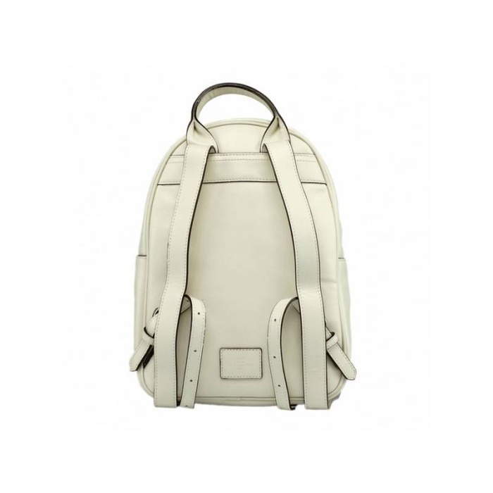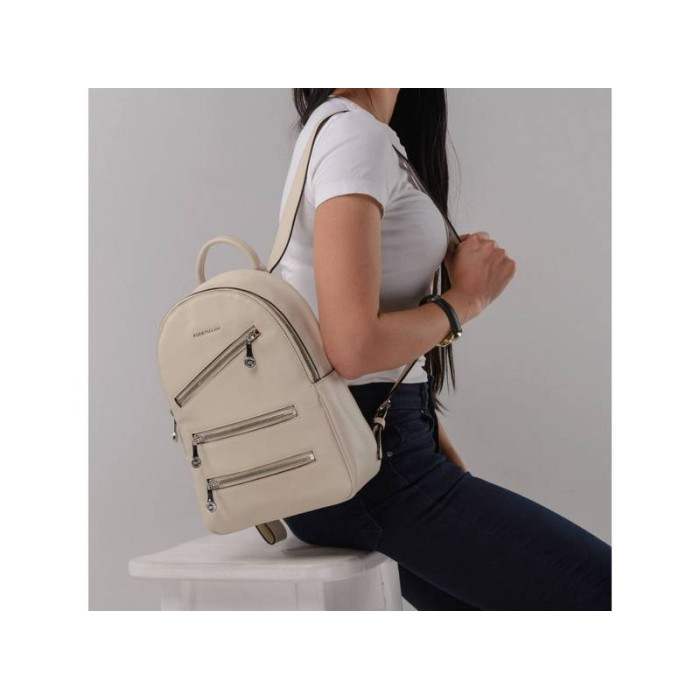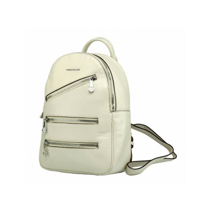 Жіночий рюкзак з телячої шкіри білого кольору. Габарити моделі дозволяють вміщати нетбук, планшет, книги, парасольку. У прохолодну пору року в рюкзаку знайдеться місце і під термокружку. З лицьового боку розташовані три невеликих кишені на блискавках. Підкладка виконана із щільної текстильної тканини червоного кольору, яка надає оригінальності моделі. Наплічні шлейки регулюються по висоті за допомогою пряжок. Є також ручка для носіння рюкзака в руці. Якісна фурнітура, універсальний колір, компактність, і при цьому місткість, роблять цей аксесуар незамінним елементом для будь-якого стилю одягу.