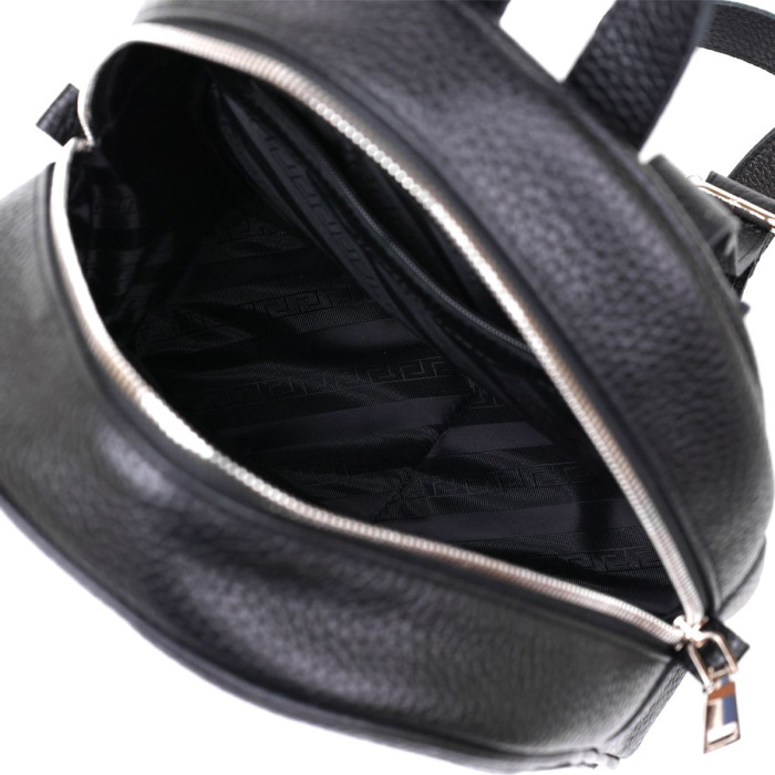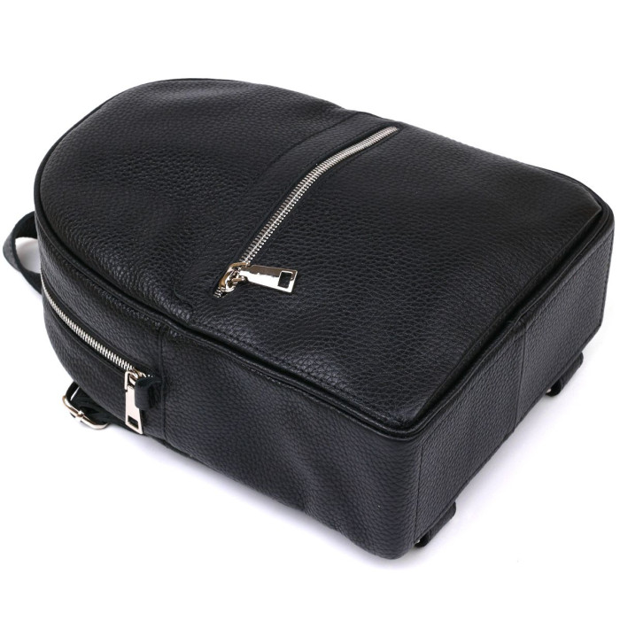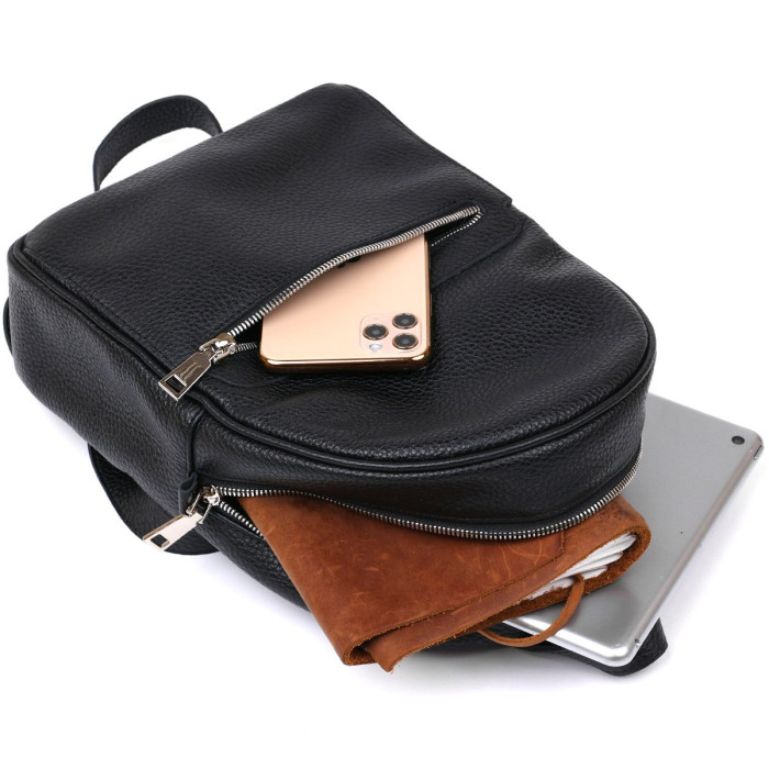 Практичний жіночий рюкзак із натуральної шкіри високої якості виконання. Має зернисту фактуру та універсальний чорний колір, тому підійде під будь-який одяг. Основне відділення дуже містке та просторе, на зовнішній стороні передбачена невелика кишеня на блискавці.