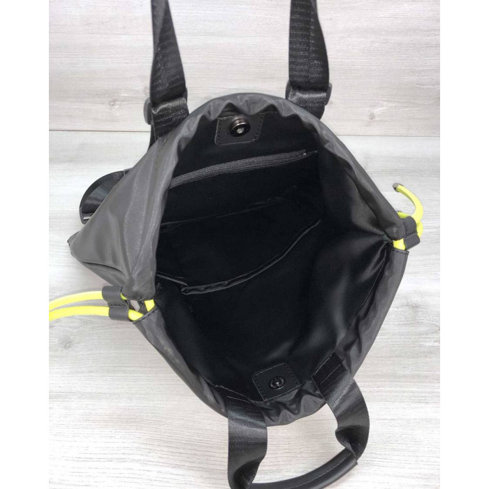 Основне відділення затягується з боків, по центру є магніт. Усередині сумка-рюкзак має дві відкритих кишені і одну на блискавці. Зовні кишеня на блискавці для дрібних предметів. Ширина кишені 17 см., глибина 16 см.