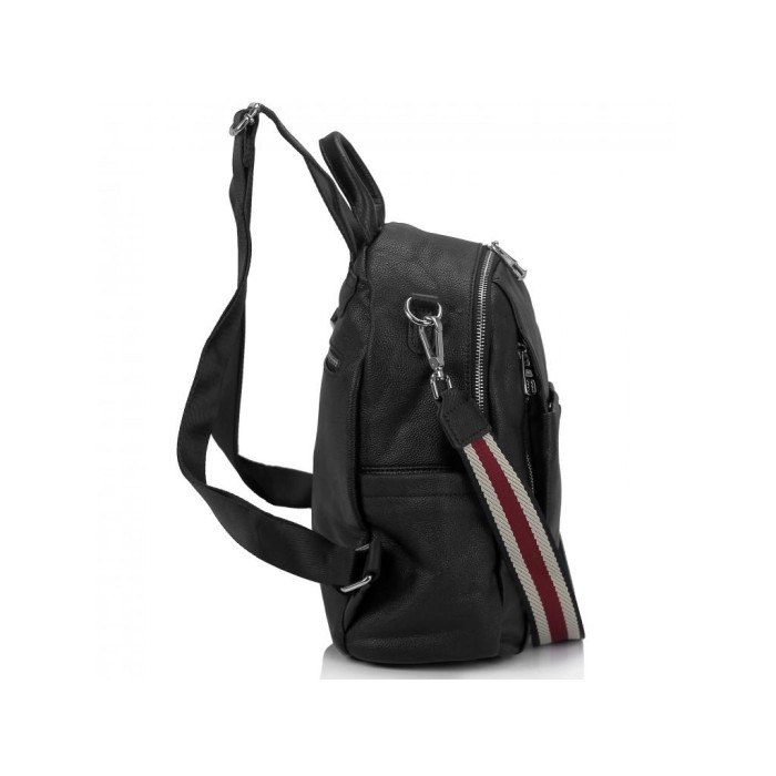 Жіночий рюкзак в чорному кольорі. Для носіння можна використовувати ручку шкіряну, ремінь через плече текстильний, який відстібається і наплічні шлейки, які регулюються по довжині. Одне основне відділення включає в себе три кишені відкритого типу і один кишеню на блискавці для дрібниць. З лицьового боку дві кишені вертикального типу з боків і одна кишеня на магнітній кнопці. З тильного боку також є кишеня на блискавці.