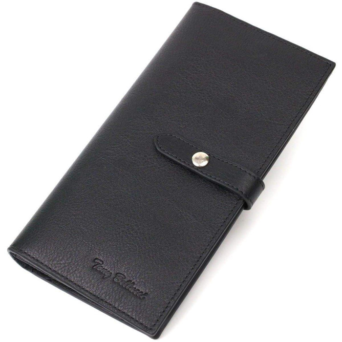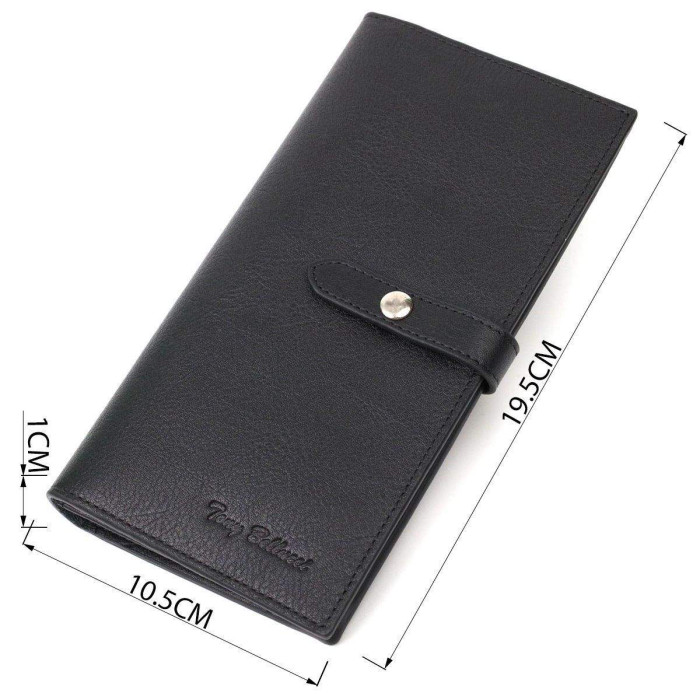 Витончений клатч із натуральної шкіри, для сучасних жінок. Аксесуар складається з місткого відділення для купюр, десяти осередків для пластикових карток, кишенька на блискавці, двох прилеглих кишень та монетниці. У виробі використано якісну фурнітуру. Клатч закривається хлястиком на кнопку, для зручності є дві кнопки, які дозволяють збільшити обсяг аксесуара.