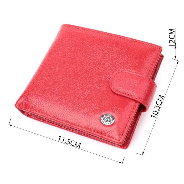 Жіноче яскраве портмоне, середнього розміру, що закривається хлястиком на кнопку. Модель пошита з якісної шкіри, яка чудово проявила себе у довгостроковій експлуатації. Аксесуар складається з двох відділень для купюр, двох прихованих кишень, одинадцяти осередків для пластикових карток, кишені під плівкою та монетниці. Модель упакована в коробочку, що дуже зручно, якщо виріб призначений для подарунка.